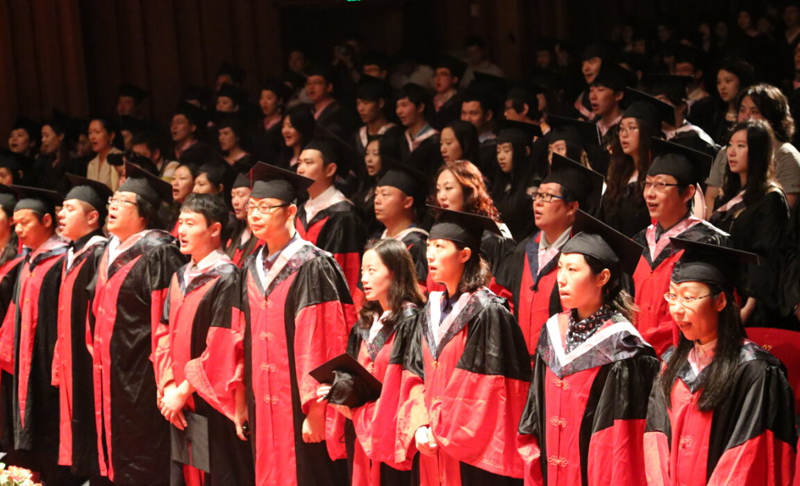 在《毕业歌》的音乐中,毕业生们身着学位服依次走向舞台,院领导们与毕业生们握手表示祝贺,并为他们拨流苏,送上祝贺信。