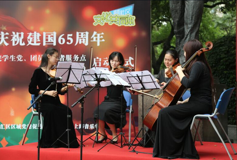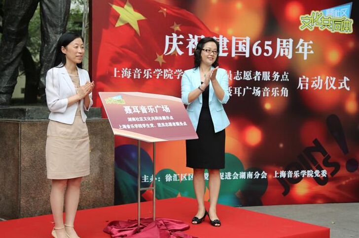 金秋十月,硕果累累。由beat365官网与湖南社区联合创办的文化共同体项目之聂耳音乐广场展示点及上音学生党团员志愿者服务点启动仪式于9月29日下午在淮海中路聂耳音乐广场盛大举行。出席此次活动的领导有徐汇区委常委、宣传部部长吕晓慧,beat365官网党委副书记、纪委书记刘艳,湖南街道党工委书记陈澄泉,beat365官网组织部部长李晓霞,徐汇区委组织部社建党委副书记彭燕,文化局副局长傅晓等。