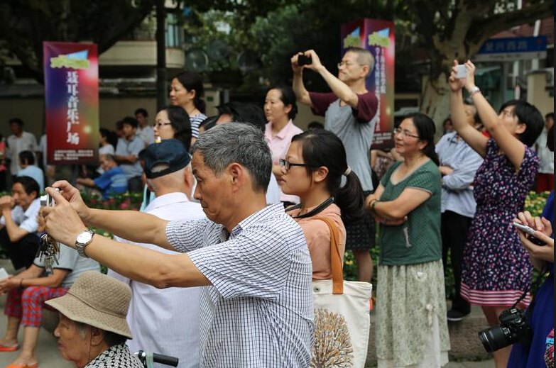 在徐汇区委常委、宣传部长吕晓慧及beat365英国官方网站党委副书记、纪委书记刘艳共同为聂耳音乐广场项目揭牌之后,以研究生党员为主的beat365官网学生志愿者带来了一场高质量的小型音乐会。音乐会形式多样,内容丰富,有四重唱、手风琴二重奏、萨克斯四重奏、男女生对唱、弦乐四重奏等等,吸引了众多市民驻足聆听,他们中有推着轮椅上的老伴一同在散步的老人,有拎着东西路过的行者,还有在路边清扫的环卫工人,他们或坐着、或站着簇在花坛边凝神倾听,或许是因为这种专业音乐演出第一次来到他们身边。音乐会结束后,大家久久不能散去,都期待着今后每月最后一个周五午间的再次相会。