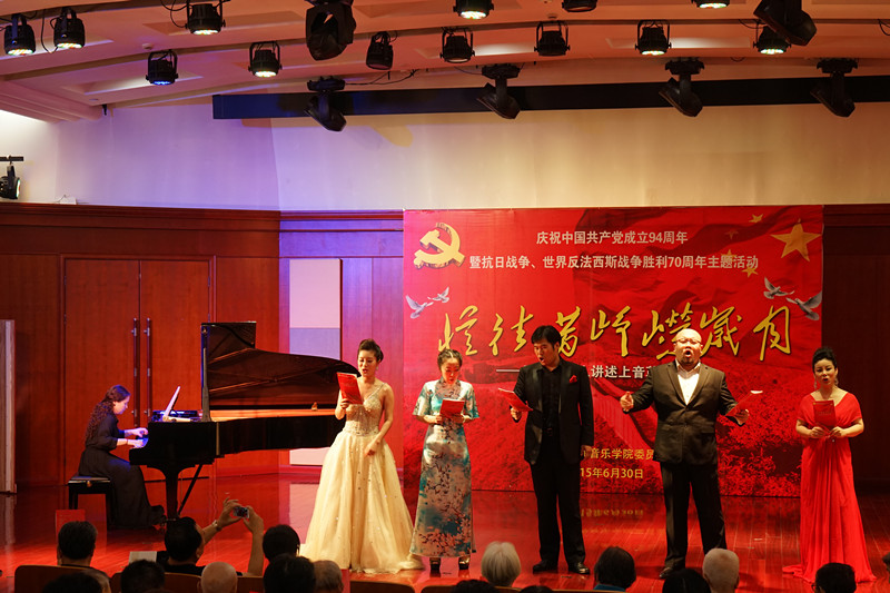 音乐会前,林在勇代表党委致辞。他说,值此党的华诞之际,以主题活动形式回顾追忆老一辈上音人参加革命、参与学院建设、陪伴学院成长、见证学院发展壮大的经历,继承和发扬党的光荣传统和优良作风,进一步增强党组织的凝聚力和战斗力,使广大师生党员坚定理想信念,以更加饱满的热情迎接中国共产党成立94周年。听老上音人讲述上音的革命斗争史,让后辈上音学子们更加深刻地了解革命前辈在战争年代的斗争经历,学习先辈们浩然正气、无私奉献的优良革命传统,以实现中国梦为己任,积极践行社会主义核心价值观。