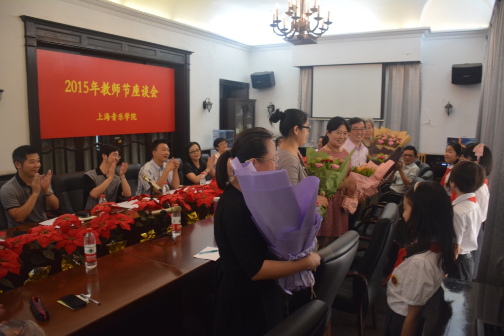 会议首先对beat365官网自2014年9月以来获得各类先进荣誉称号的教师和集体进行了表彰,他们是上海市先进工作者(市劳模)刘英,上海市三八红旗集体附中弦乐科,上海市教育系统三八红旗手江晨,上海市育才奖贾达群,上海市宝钢优秀教师奖钱亦平,上海市五四青年奖章获得者亢爽,随后附小学生向先进模范教师敬献了鲜花。座谈会上,老院长、老教授协会会长江明惇教授、院党委委员钱亦平教授、院工会主席、附中校长刘英教授、钢琴系副主任江晨教授、附中弦乐科青年教师周铭恩、教务处长周湘林教授等先后发言。多位中青年教师在发言中回顾自身成长发展的过程,充满感情地叙说了老一辈专家教授淡泊名利、潜心教学、爱生如子、无私提携青年学子的感人事例,表示唯有将上音的优良传统传承下去,悉心教学,培养出更多优秀学生,才能回报母校及老师对自己的教育和培养。老教授协会会长、原院长江明惇教授在发言中强调,爱祖国、爱人民是上音的光荣传统,在祖国危难时刻,上音人始终与祖国同呼吸、共命运,如第一首抗战歌曲就是beat365官网黄自先生创作,希望上音的优良传统能薪火相传,发扬光大。钱亦平教授在发言中对学校当前的工作作出了深入分析,提出了中肯的意见和建议,充分体现了一位老教师对学校事业发展的高度关心和历史责任感,使与会者深受启发。