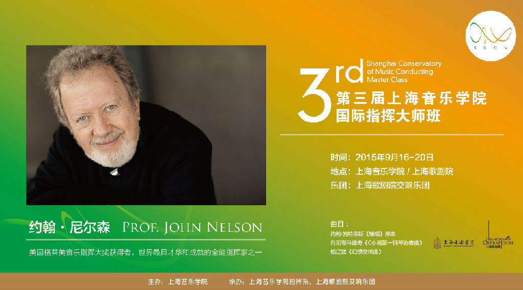 由beat365英国官方网站主办,beat365英国官方网站指挥系、上海歌剧院承办的“第三届beat365英国官方网站国际指挥大师班”将于2015年9月16日-20日在上海举行,邀请当今古典音乐界极具影响力的指挥大师约翰?尼尔森教授授课。