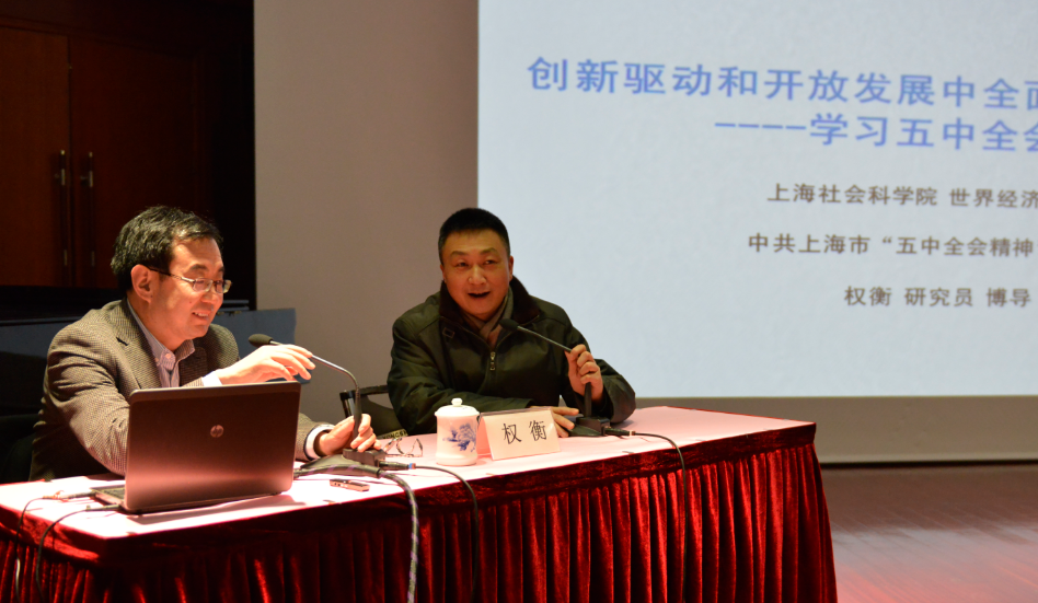 12月16日下午,上音举行中心组学习会,邀请到市委讲师团成员、上海社科院世界经济研究所副所长权衡研究员,以“创新驱动和开放发展中全面建成小康社会”为题做了辅导报告,专题学习十八届五中全会精神。学习会由院党委书记、院长林在勇主持。