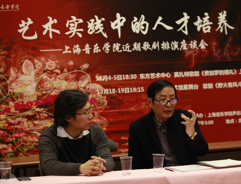 临近年末的12月,对于声乐歌剧系来说是紧张和忙碌的,一个月内上演《费加罗的婚礼》(下面简称《费加罗》)和《野火春风斗古城》(下面简称《野火》)这2部一共4场歌剧,收到了良好的业内反响和社会效益。为了进一步总结此次歌剧演出的经验,一场主题为“艺术实践中的人才培养”的座谈会于21日下午召开。