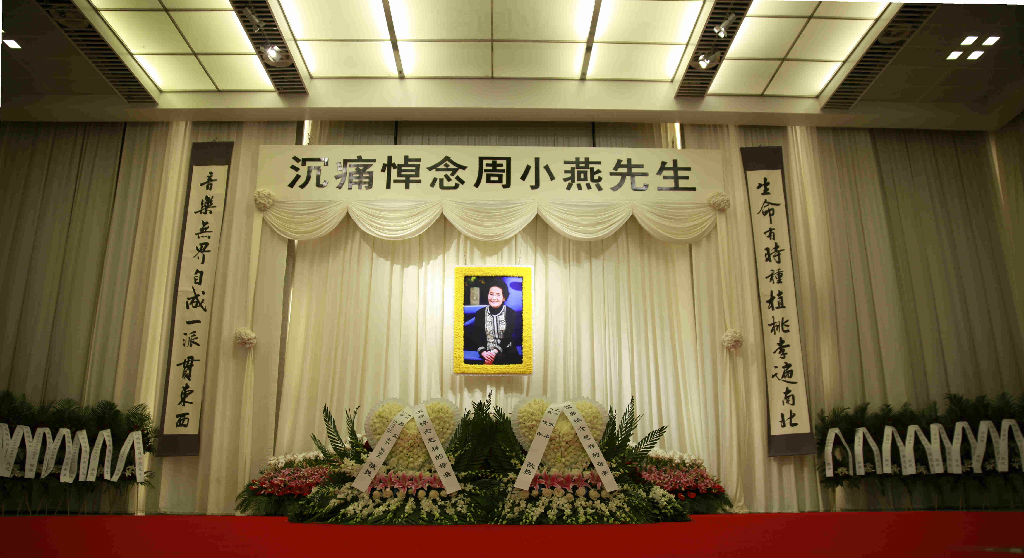 10日上午,龙华殡仪馆大厅内气氛庄严肃穆,周小燕同志的遗体覆盖中国共产党党旗,安卧在鲜花之中。一副长联高挂厅内,“生命有时种植桃李遍南北,音乐无界自成一派贯东西”凝炼概括了她的世纪人生。10时30分许,尹弘、钟燕群、翁铁慧、姜樑等向周小燕同志遗体三鞠躬,作最后送别。