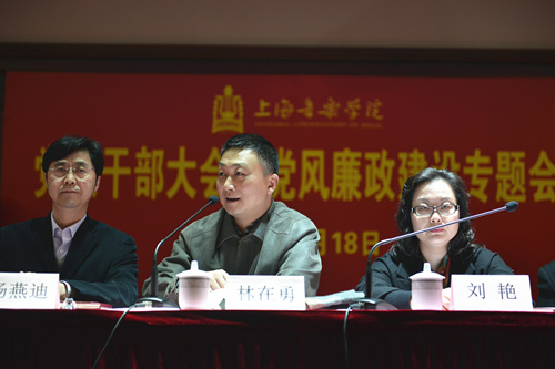 在总结发言中,院党委书记、院长林在勇对上音在国家和上海市战略发展框架下、在新的定义上办学提出了更高的期望。他表示,十三五规划、深化综合改革的部署、现代大学制度的推行,对学校领导架构、运行机制都提出了新的要求,未来可能继续探索校务委员会、第三方监督等各种形式的民主机制。党风廉政建设层面,他要求以更严格的标准、更落地的措施营造更好的党风和校风,并使之成为新常态;要求所有干部教师争做合格党员,严格要求自身,加强职责意识、价值意识,理解制度,明确边界,同时又敢于作为。最后,他希望全院上下都能从提升学校实力和竞争力出发,抓紧时间加强学习、转变观念,做好基本学科建设,研究人才培养和持续发展规律,相互理解、支持、配合,实实在在推进工作,为学校的建设做出贡献。