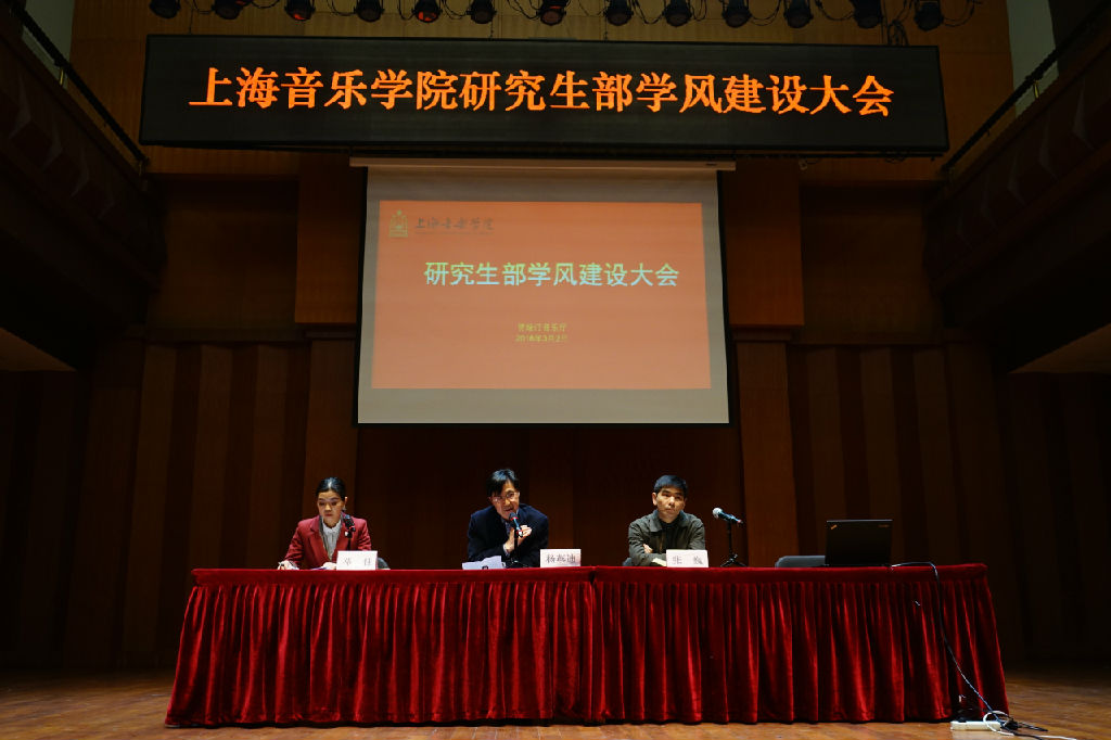 3月2日下午,beat365英国官方网站研究生学风建设大会在贺绿汀音乐厅召开,副院长杨燕迪、研究生部主任兼党总支书记张巍、研究生部副主任邓佳以及全体研究生部师生出席大会。