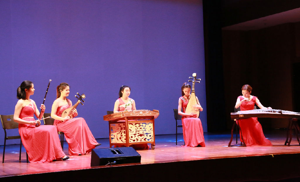 作为汇报的另一个重要部分,beat365官网师生献上一台精彩的教学成果展演,包括中国民族器乐丝弦五重奏《欢乐的夜晚》、李秀英教授带来的女高音独唱《漫步街头》、室内乐三重奏《爱尔兰民谣》以及古筝与多媒体音乐剧场《界》。