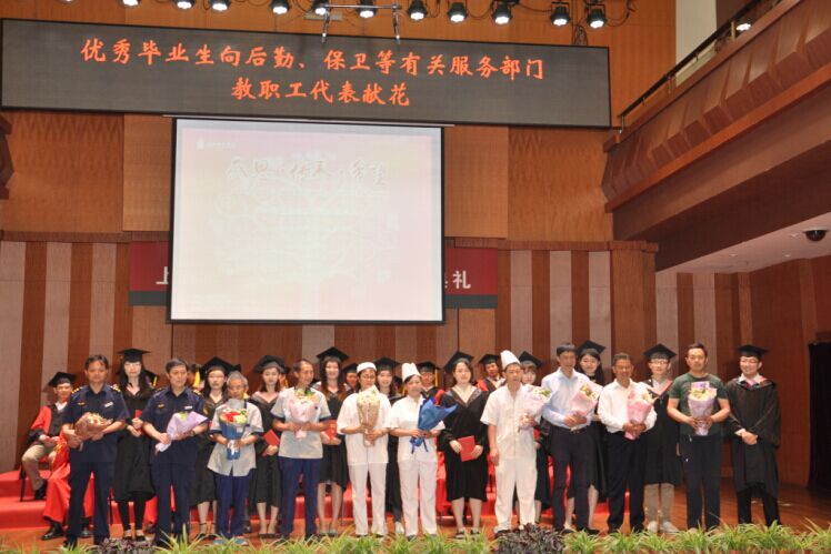 毕业生的成长离不开教师们的辛苦耕耘,在幕后还有一群人默默的奉献着,通常称呼他们为大叔、阿姨和师傅,后厨、绿化带、盥洗室、门岗就是他们的“讲台”,他们是我们上音学子眼中最可敬的人,在毕业典礼中,毕业生们献上了鲜花感谢他们的辛勤付出。