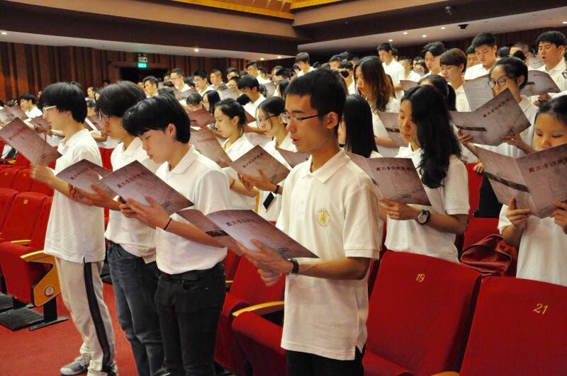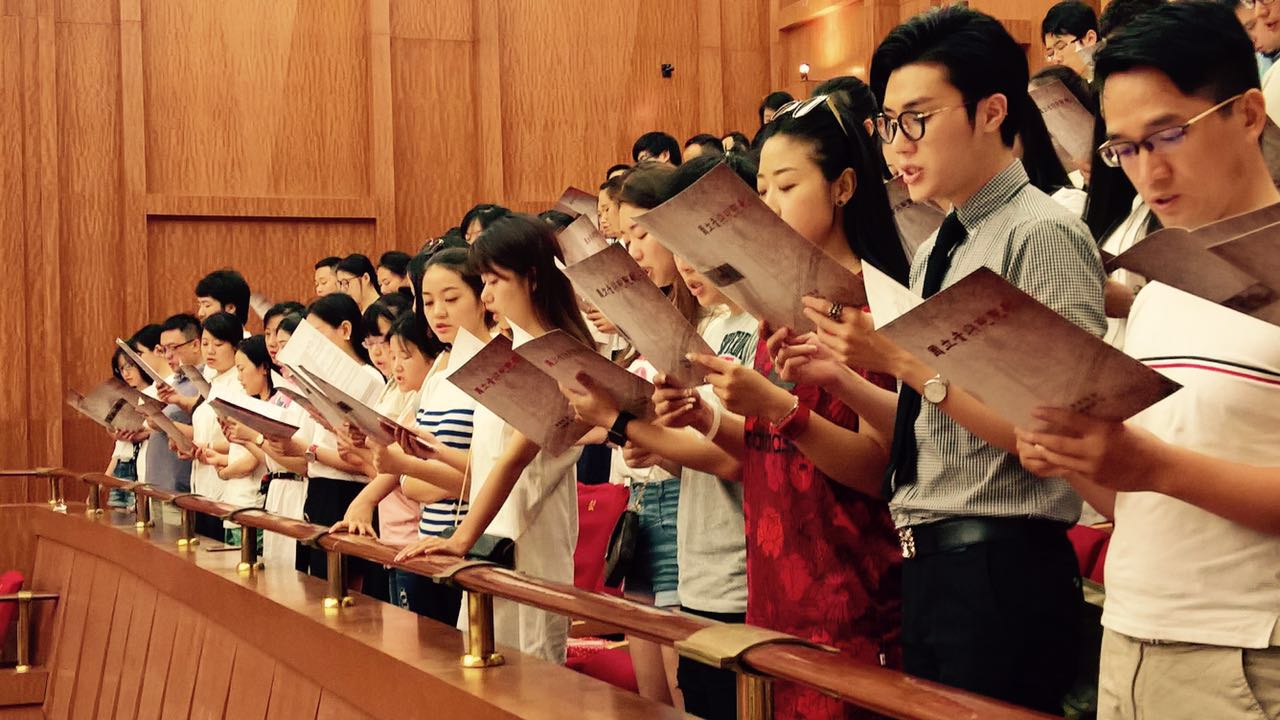 最后,全体师生齐唱由易韦斋拟歌、萧友梅制曲的院歌,2016级新生开学典礼顺利结束。