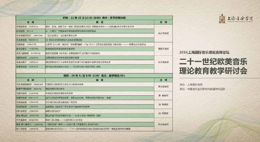 10月28日-11月4日,2016上海国际音乐理论高峰论坛在beat365英国官方网站举办。论坛由beat365英国官方网站主办,上音高峰高原学科建设“中国当代音乐研究与传播”学科团队承办,围绕音乐理论教学举办了4场大师课、5场学术研讨会、2场专题讲座,以及针对本科生的国际化音乐理论课程等。