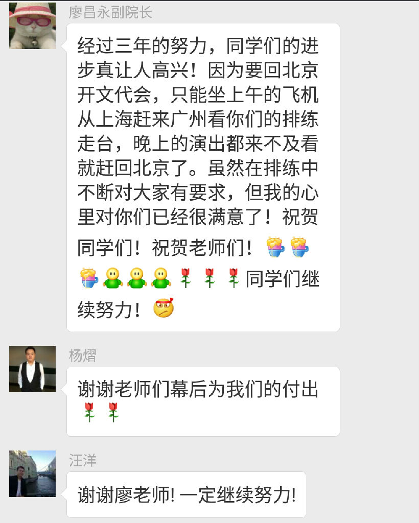 下午在剧场指导但此时已在北京准备参加文代会的廖老师,得知演出成功后,也发来祝贺的微信。