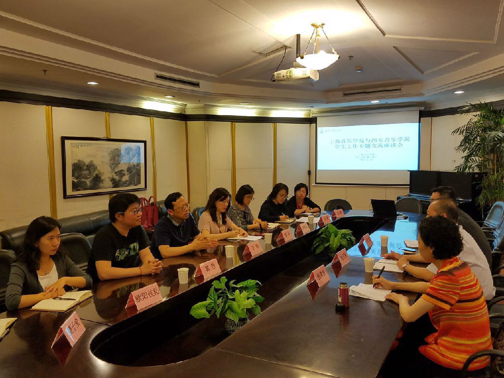 王瑞首先欢迎西安音乐学院老师们的到来,上音与西音长期密切交流,保持友好的互动关系,两所学校同为艺术类院校,很多方面的工作存在类似情况而又有不同特点,西音学生规模高于上音,在工作管理方式、实践经验、学生住宿等方面值得上音学习。刘正利感谢上音的邀请,此次来到上音希望在学生工作方面学习上音的特色经验和先进做法,更好地促进西音学工、团委相关工作的开展。