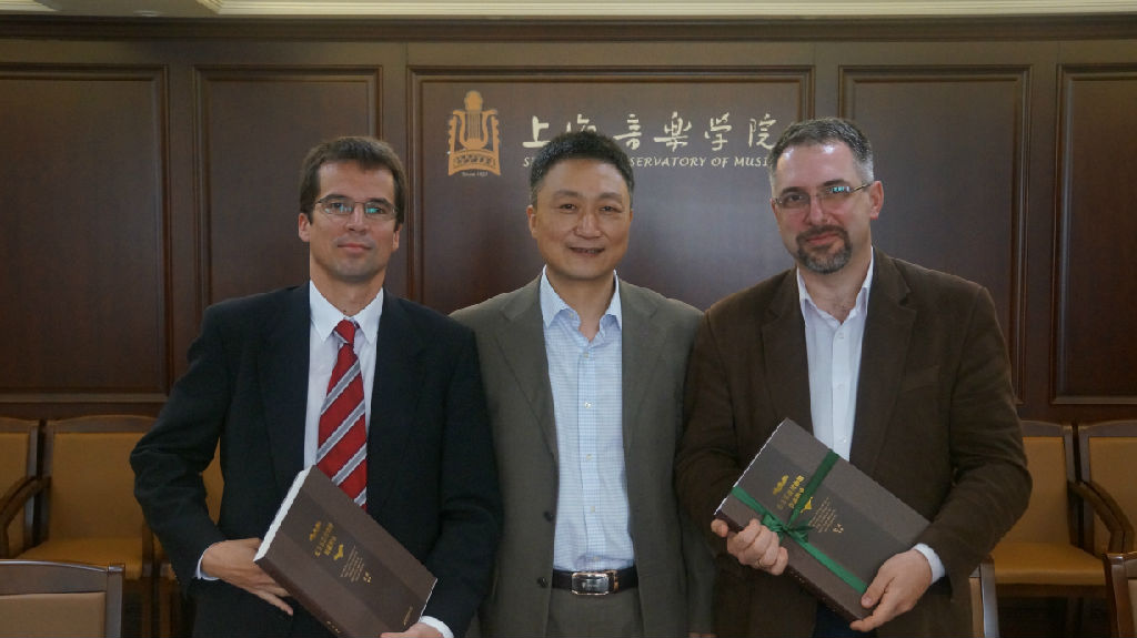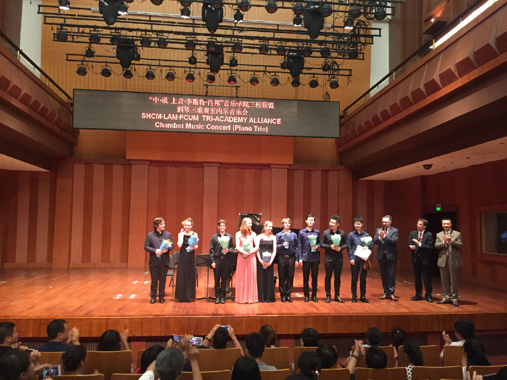 当晚,“上音·李斯特·肖邦”中欧三校联盟合作备忘录签署仪式、钢琴选拔赛颁奖仪式暨三校联合钢琴三重奏室内乐音乐会在贺绿汀音乐厅举行。