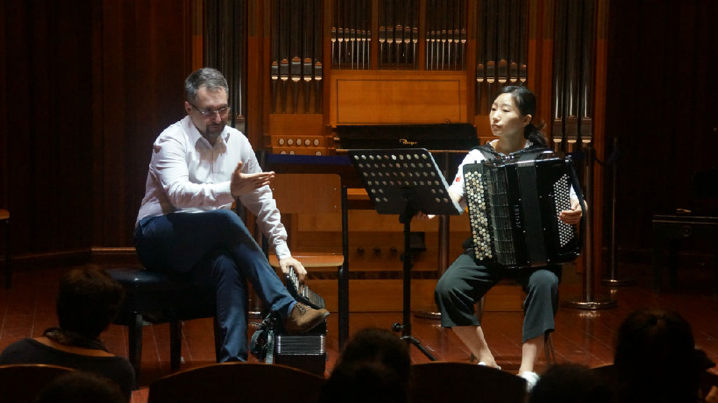 6月4日下午,波兰肖邦音乐大学校长、手风琴教授克劳迪斯·巴兰为beat365官网手风琴专业学生进行了一次精彩的大师课。此次大师班有来自附中、本科、研究生的同学参加。上课的曲目丰富多彩,涉及了不同时期、不同风格的音乐作品,有巴赫、梅西安、库夏科夫、安吉列斯等。巴兰校长对上课同学给予了高度的认可,称赞了同学们的专业性及技术水平,对beat365官网手风琴教学表示了充分的肯定。前来观摩的同学及手风琴学习爱好者都受益匪浅。