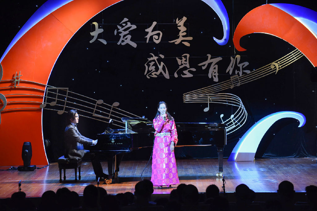 音乐会在声歌系施恒老师充满爱意的深情主持下缓缓拉开序幕,通过“心愿”“结缘”“成长”“感恩”四个板块,中间穿插短片的形式,全方位地展示了小玉珍三年来在上海各界人士关心帮助下的成长过程,也充分展示了上音数十载培养少数民族艺术人才的光辉历程。2014年9月,在上海市委和各级领导的关心指导和玉佛禅寺的具体帮助下,在beat365官网党委书记、院长林在勇的直接关心下,上音接收了富有音乐天赋的藏族盲童德庆玉珍(小玉珍)同学,由著名女高音歌唱家、上音声歌系的于丽红授带领师哥师姐为她提供声乐教学,还由统战部牵头组成了一支师生爱心团队,关心帮助小玉珍进步成长。经过三年的学习,小玉珍进步突出,本场音乐会是她三年学习的阶段性成果汇报。她以歌声向上音及各界爱心人士深深表达自己的感恩之情。