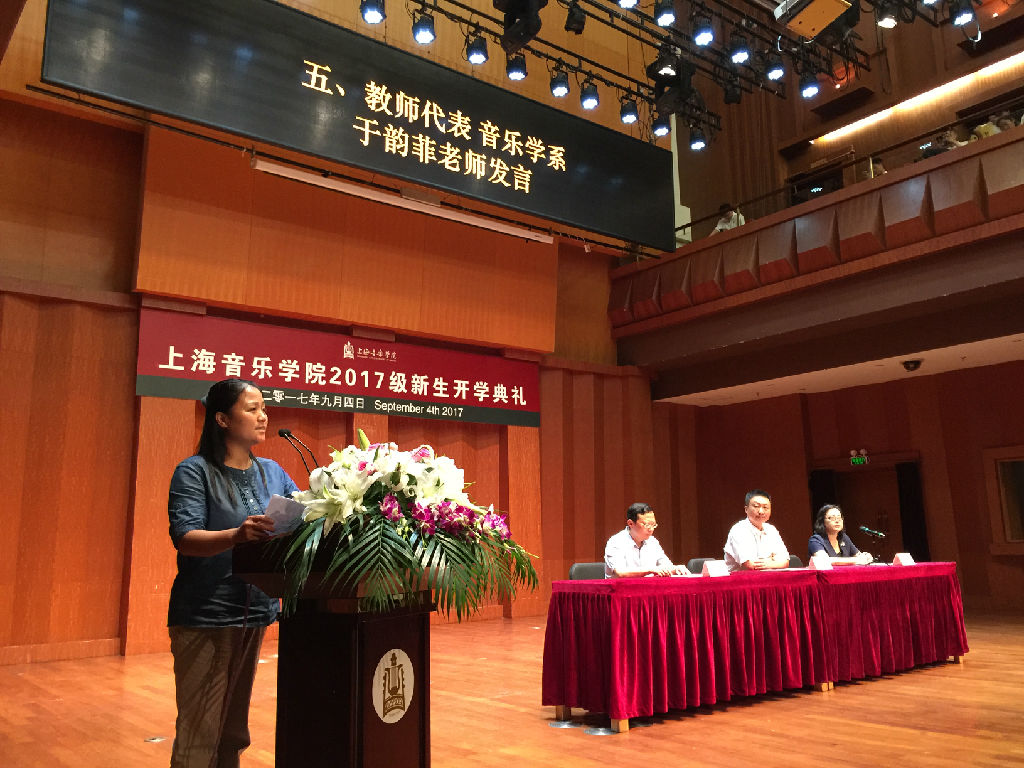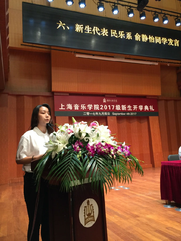 之后,教师代表、音乐学系于韵菲老师与新生代表、民乐系俞静怡同学分别作了发言。于韵菲老师四次进上音,每次都有不同的感受,从本科、硕士研究生、博士研究生再到现在的教师,她与上音有着深厚的感情。于老师将她对上音的爱都转换成了对学生的教育以及学术上的研究动力,获得了第十三界上海哲社科学优秀成果论文类一等奖。于老师的发言道出了全体上音老师们对上音、对同学们的心声,也让新生们对即将开始的大学之旅充满了兴奋与期待。