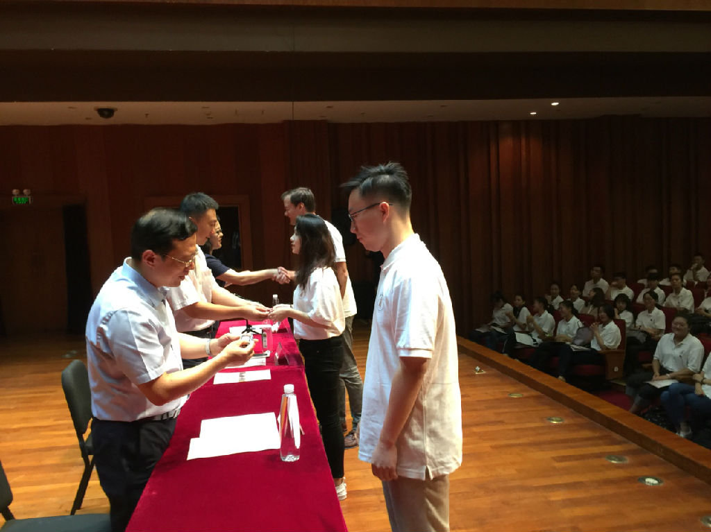 今年正值上音90周年校庆,开学典礼中,设置了为新生们授予上音校徽的环节,以此寄望新同学们践行上音“和毅庄诚”的校训,传承上音精神。