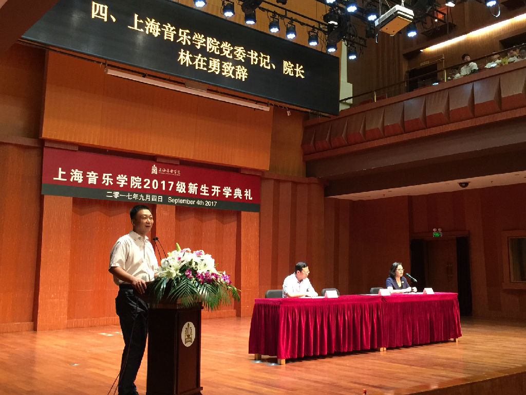 林在勇在致辞中与同学们进行了真切而深入的交流,回顾了上音的发展历程,并对大家提出期望。他说,在艺术创作与表演中,音乐居于核心地位,音乐是灵魂性的价值所在。同学们作为新时代的“上音人,对于音乐的建设,对于价值的挖掘,在思想上要更加重视。同学们要超越俗见的价值高度,成为国家和历史的文化推进者、创造者、建设者和传播者,要看得见未来。要增强文化自信,自觉践行社会主义核心价值观。要坚守优良传统,对艺术一丝不苟。林院长的一句句箴言深深地激励着台下的每一位新生,同学们的掌声久久不能停歇。