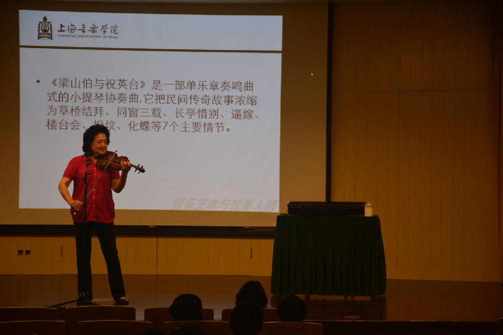 此次研讨班第一讲由俞丽拿教授主讲《梁祝》赏析,俞先生首先为在座学员们生动地讲述了小提琴协奏曲《梁祝》的创作背景与演奏历程,随后在分析《梁祝》曲式结构时伴以细致入微的解说与演奏。在两个多小时课程中,学员们沉浸于《梁祝》故事中,课程结束报以热烈的掌声。