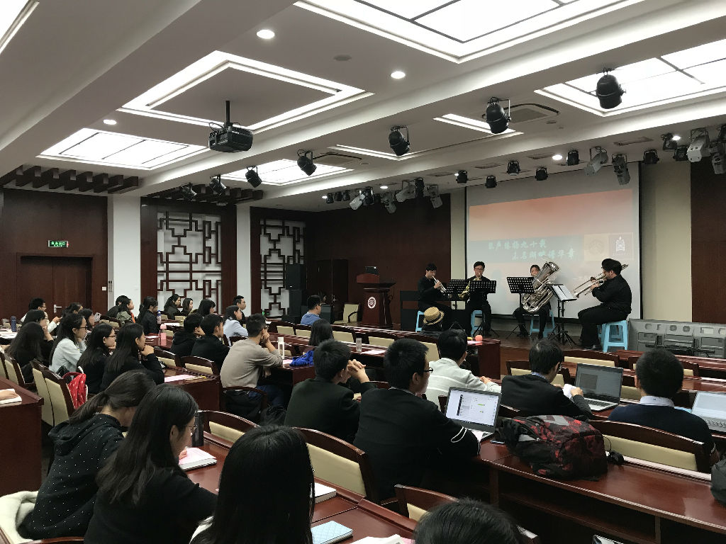 铜管五重奏的《卡门幻想曲》和《游击队之歌》采用了中西结合的方式,通俗易懂令人耳目一新;木管五重奏的《春江花月夜》、小提琴独奏曲《梁祝》、弦乐四重奏《情深谊长》和海顿的《五度四重奏》都与北大的人文气息相呼应,深受北大师生的好评。肖斯塔科维奇《五首小品——为两把小提和钢琴而作》、穆索尔斯基《荒山之夜》以及于鑫老师和黄秋宁老师带来的萨克斯独奏《幻想曲》和《自由探戈》,使整场音乐会风格各异,灵动多变。出色的技艺和精湛的表演,不仅展示了beat365官网师生扎实的基础功底,还很好地诠释了作曲家的创作技术和作品精神,获得了全场热烈的掌声和欢呼声,现场高潮不断,交流活动圆满成功。