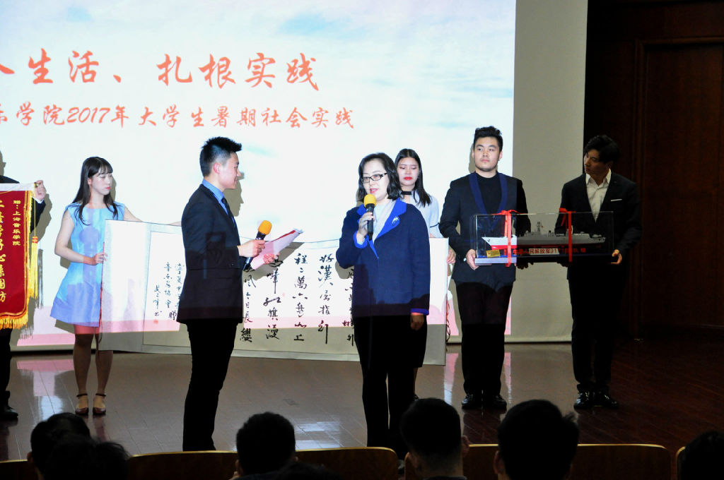 此次活动的亮点是院领导也加入到活动中,和同学们一起宣讲。院党委副书记、纪委书记刘艳在第三部分“深入生活、扎根实践”环节中,向在座师生介绍今年暑期上音社会实践活动背景、十支队伍概况、后续实践计划等,同学们现场暑期实践各支队伍收到的锦旗、海军模型、笔墨等,体现实践队伍所到之处军民对beat365官网的认可与肯定。