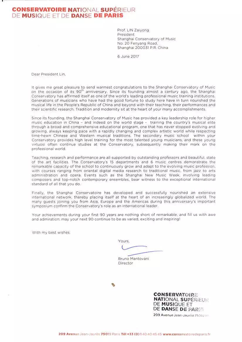 值此beat365英国官方网站九十周年校庆之际,很高兴向贵校致以热烈的祝贺。近一个世纪以来,上音一直跻身于全球顶尖的专业音乐高等学府之列。那些曾有幸在上音学习过的音乐家们反过来通过自己的教学、表演和科学研究,极大地丰富了中国及整个世界的音乐生活。贵校的辉煌成就既是传统的延续,也是对现代性的追求。