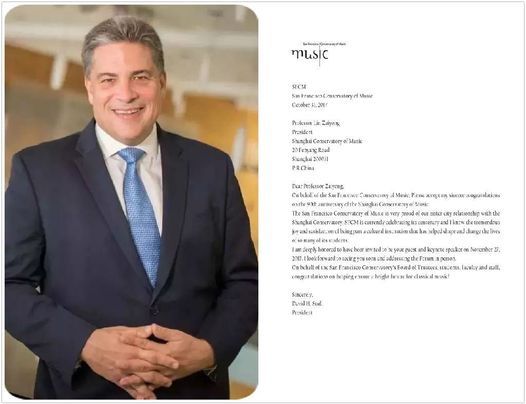 我们为旧金山和上海之间的姐妹城市关系感到骄傲,也为我们两校之间的友谊感到自豪。今年也是旧金山音乐学院的100周年校庆,我深知,对于一家文化机构,能够帮助塑造和改变众多学生的生活,是何等的喜悦和满足啊!