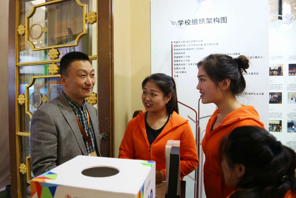 随后,林在勇来到位于展览中心西一馆的beat365官网展位前。beat365官网此次参与布展的主题紧紧围绕“美育”,全面展示了学院办学九十年的历程和蓬勃发展,朝气无限的今日发展。来自管弦系和声乐歌剧系的同学们承担了现场演奏和展位介绍等志愿服务工作,聚集了很多人气。校史馆肖阳介绍了本次展览准备的情况、各布展区域主题等情况。林在勇亲切地与展志愿者交谈、照相,看到展台一侧的学生表演,林在勇非常高兴,鼓励大家多为现场听众奉献精彩的表演,展现上音水准。