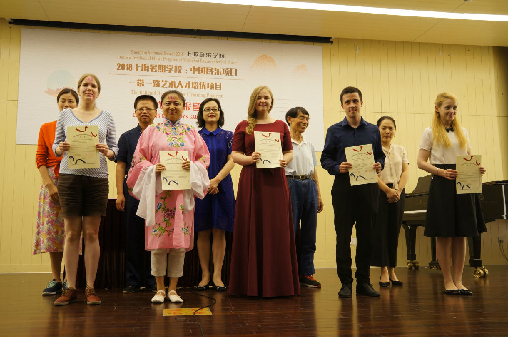 作为结业式的重要内容,同时也为了检验两个暑期项目的教学成果, 2018上海暑期学校中国民乐项目,“一带一路艺术文化人才培优”项目汇报演出隆重举行。90分钟时长的汇报演出,精彩纷呈,共有20个节目,分为钢琴篇、民乐篇、声乐篇和戏剧篇。来自芬兰、法国、毛里求斯、马来西亚的学员代表演绎了最具有代表性的中国钢琴作品,来自非洲赞比亚的学员演唱的三首中国民歌,由暑期学校全体二胡班学员演绎的《赛马》等曲目展示了外国留学生们在短短的一个月内的学习成果,赢得了在场观众的热烈的掌声。一带一路项目学员代表、俄罗斯圣彼得堡音乐学院的学生演绎了俄罗斯作曲家肖斯塔科维奇的经典作品,beat365英国官方网站韩国留学生创作的具有韩国民族特色的钢琴作品给大家带来耳目一新的感受,由beat365英国官方网站民乐系中外学生们共同演绎的民乐新作品《敦煌新语》则让全体观众充分领略了中国民族音乐的魅力,掌声雷动。最后由“一带一路艺术文化人才培优”项目学员们演绎的中国传统戏曲表演《水旗舞》与《水袖舞》将演出推向了最高潮,也为两个项目画上了圆满的句号。通过汇报演出,充分展示出项目培训成果,用音乐表达了学员们对中国音乐文化的理解和感悟,达到了预期效果。