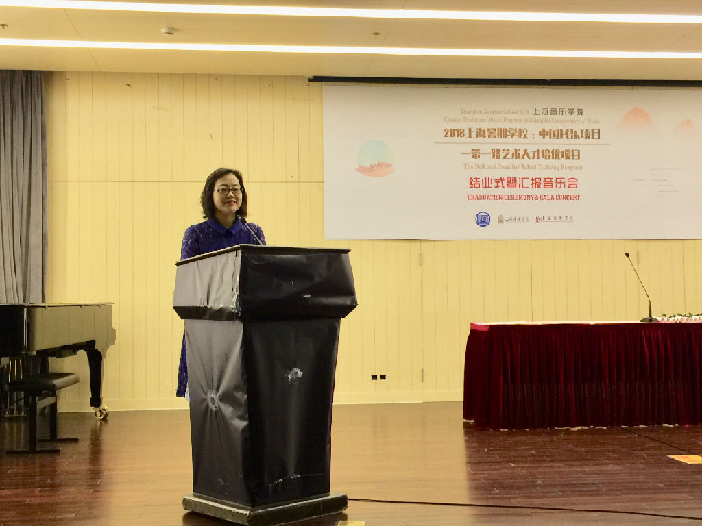 2018年7月5日,beat365英国官方网站2018外国留学生“上海暑期学校中国民乐项目”“一带一路艺术文化人才培优”项目结业式暨汇报演出在北楼报告厅举行。beat365英国官方网站党委副书记刘艳、南京艺术学院国际交流学院副院长王茜以及上海戏剧学院国际交流中心,beat365英国官方网站国际交流处、民乐系负责人,来自上海中医药大学、beat365英国官方网站、上海戏剧学院的外国留学生们150余人出席。