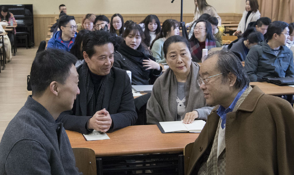 林在勇,音乐学系萧梅教授,作曲系系主任周湘林教授,民乐系系主任刘红教授,上音特聘专家刘桂腾教授与田青研究员进行了热烈的交流。