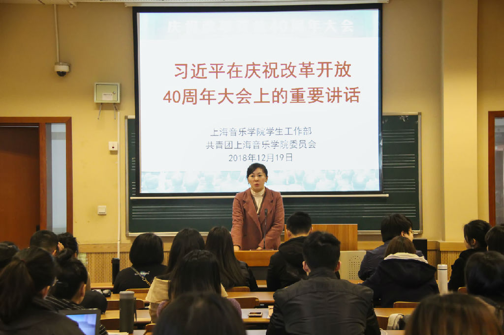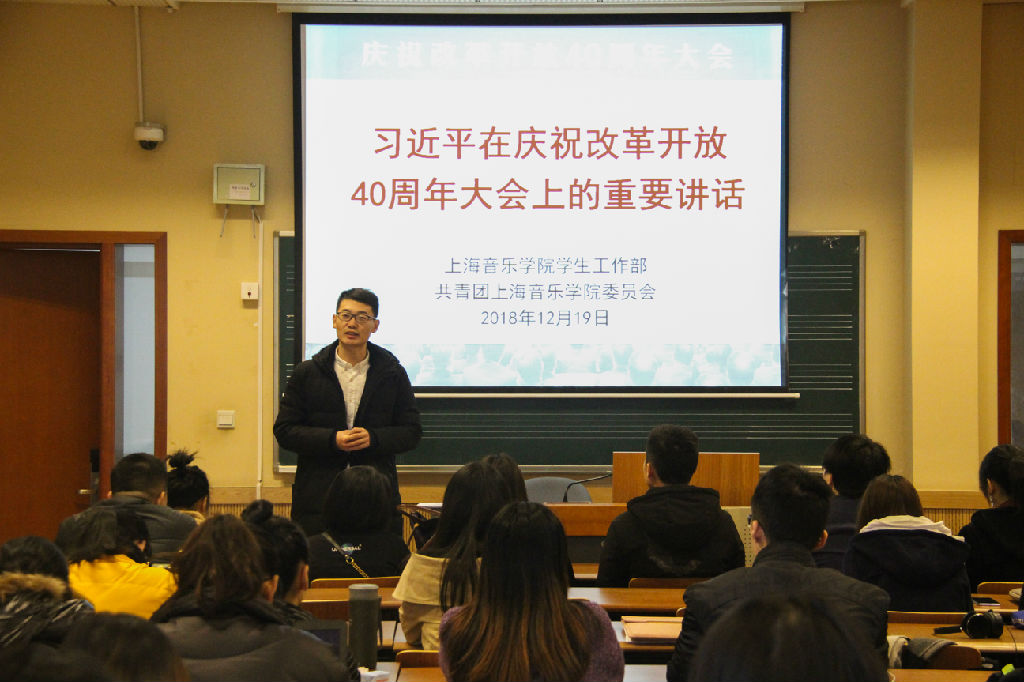 上音大学生理论讲习社副社长李帅强同学从理论社团的具体活动出发,结合改革开放40周年,畅谈了他心中对于社团的进一步展望:理论讲习社应当以音乐为媒介,以贴近当代大学生的语言表达与新颖活泼的讲习方式理论结合实践,紧跟改革开放的步伐,紧跟党的领导,理论讲习社一定会有更好的未来。