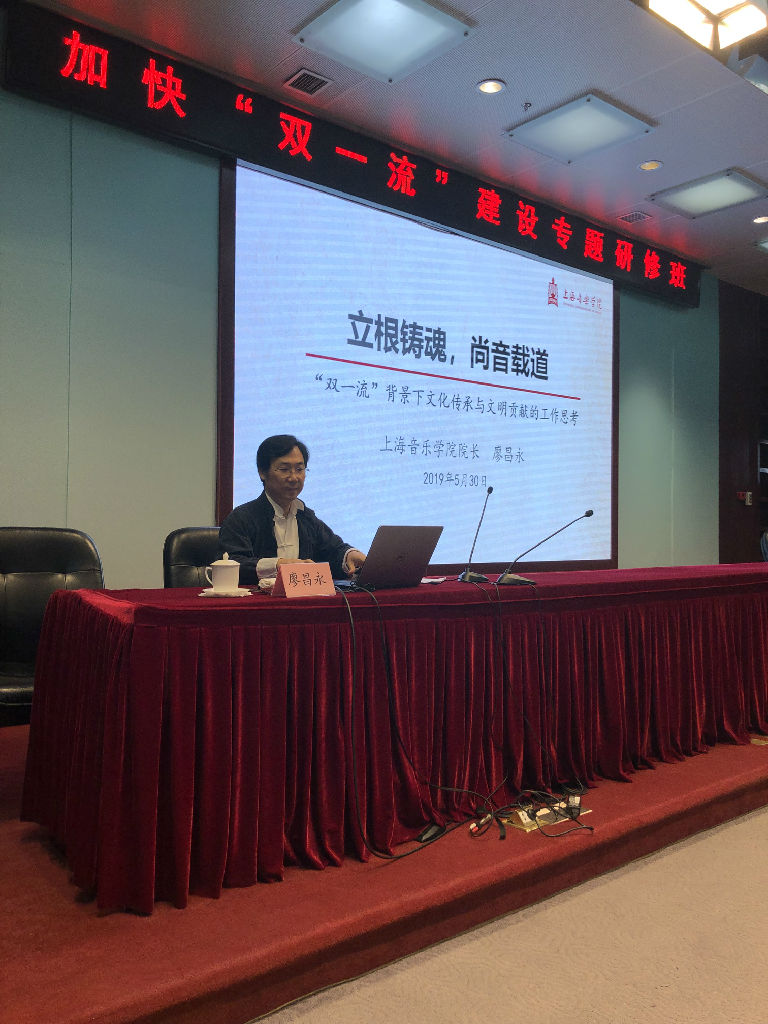 5月30日上午,beat365官网院长廖昌永教授代表学校为专题研修班作《立根铸魂,尚音载道:“双一流”背景下文化传承与文明贡献的工作思考》专题报告。廖昌永首先从声乐演唱角度谈中和西的问题,从美声唱法教学实践探索中国艺术歌曲的文化传承与推广;其次,从美育教育传承角度,介绍上音办学的“美育”传统和新时代中华美育传承践行,从一流人才培养、社会服务与文化影响、国际化合作与文化推广等角度予以阐述;最后,从“立德树人”角度来谈“双一流”建设思考,以“为时代画像、为时代立传、为时代明德”新要求,介绍上音以原创剧目创作排练融合思想政治教育特色案例,推动文化“走出去”并加强人才培养立根铸魂的思政新模式。