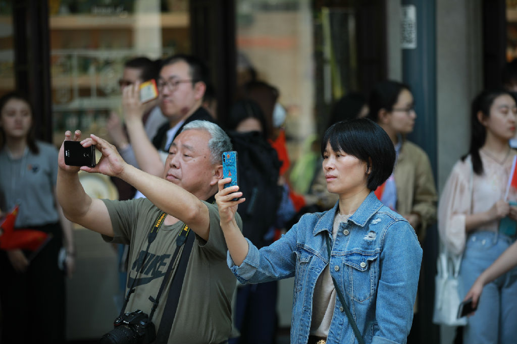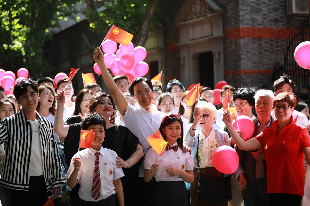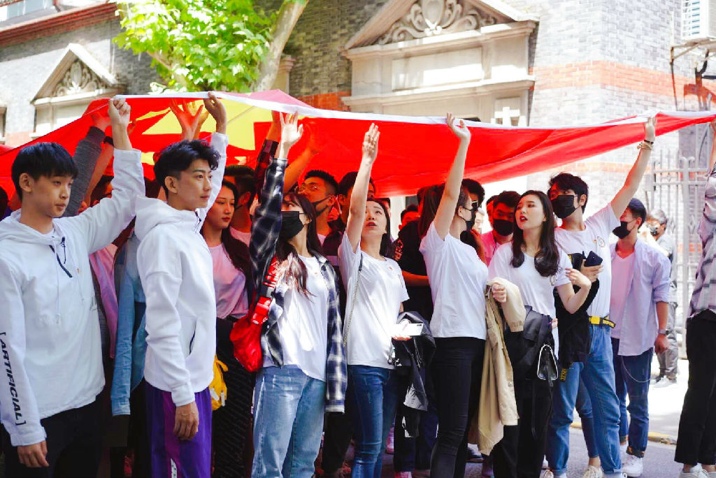 活力满满的上音人手持红色国旗与气球,不断挥舞!在一面撑满马路的“巨幕”国旗下形成一片红色的海洋。在弥漫着春日余香与夏日清甜的五月里,上音人用歌声带领上海市民,向祖国表达最诚挚的爱意。他们充满朝气的歌声,回荡在中共一大会址的上空,来来往往的游客不禁驻足,纷纷举起手机记录下这青春、热情、特别且动人的一刻。
