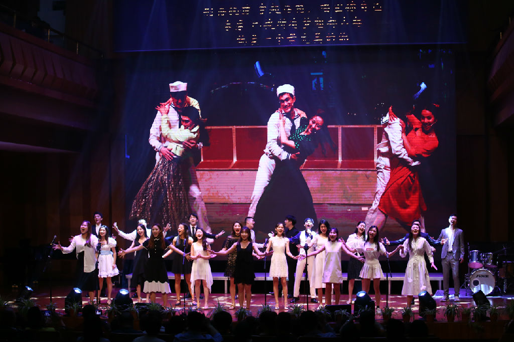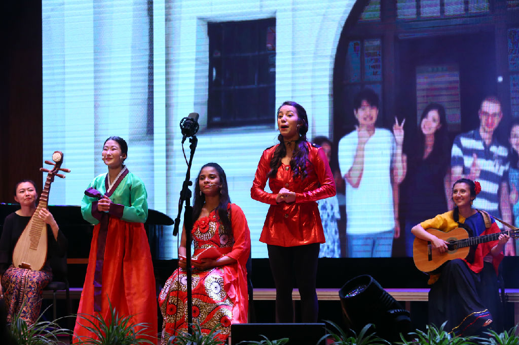 由国际教育学院的留学生们带来的音乐情景剧《GOOD MEMORIES》开启了本场晚会的第二章“求真·惜音”。本节目由留学生艾琳作词作曲,来自哥伦比亚、加拿大、新加坡等世界各地的留学生们一齐用生动的演出形式表达了对校园的这份热爱。