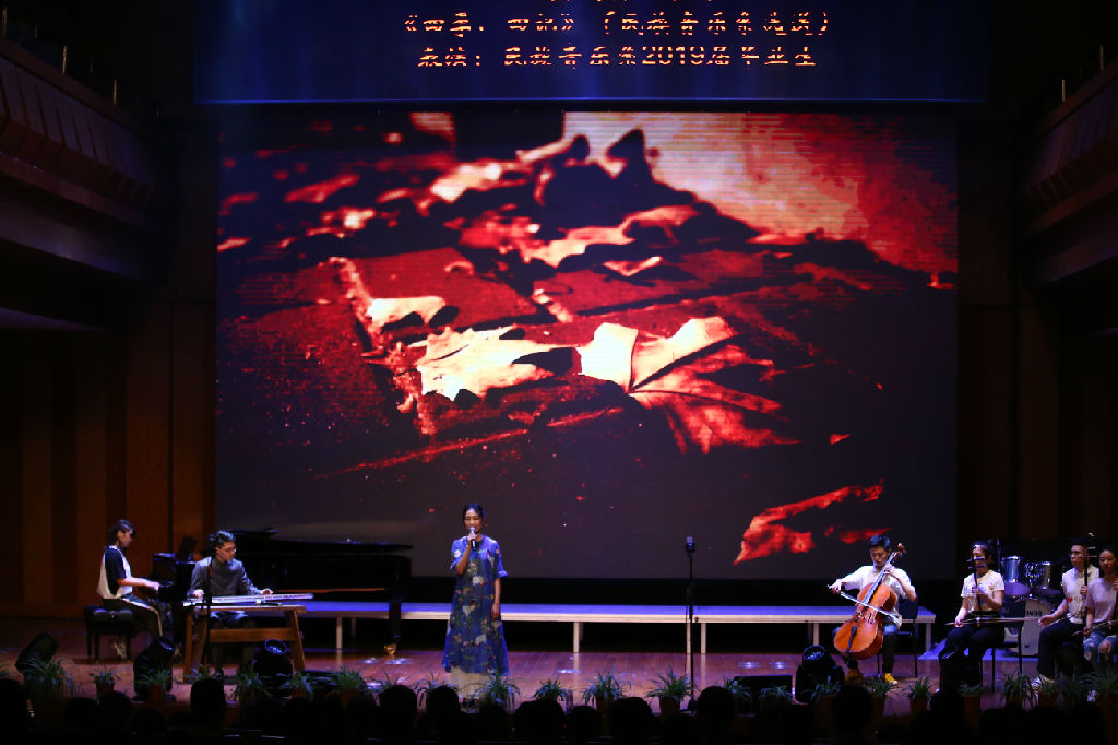 民族音乐系的毕业生带来了微型民族器乐剧《四季,四记》,通过舞蹈、器乐合奏、配乐朗诵等形式演绎出同学从大一到大四初识、欢聚、沉淀、惜别的校园时光。