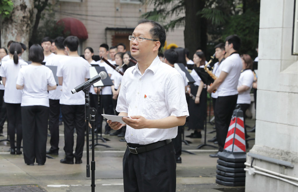 现代器乐与打击乐系支部书记杨茹文教授作为优秀的党务工作者、教师代表讲话。他表示,我们应勿忘初心,立足本职、踏实奉献;勇于创新,力创世界一流;尽教师党员的最大职责,立德树人,认知践行,牢记于心。才能无愧于教师的称号,无愧于共产党员的身份,无愧于渴求知识的学生们。让我们的祖国,让我们的上音在世界的大舞台上绽放更绚烂的光彩。