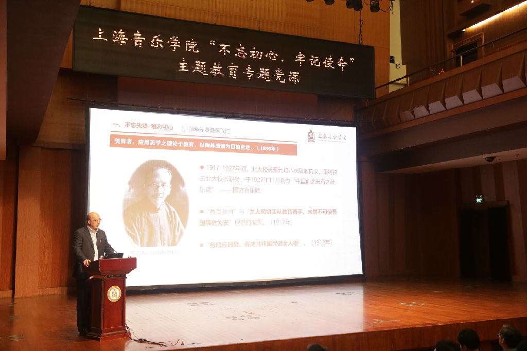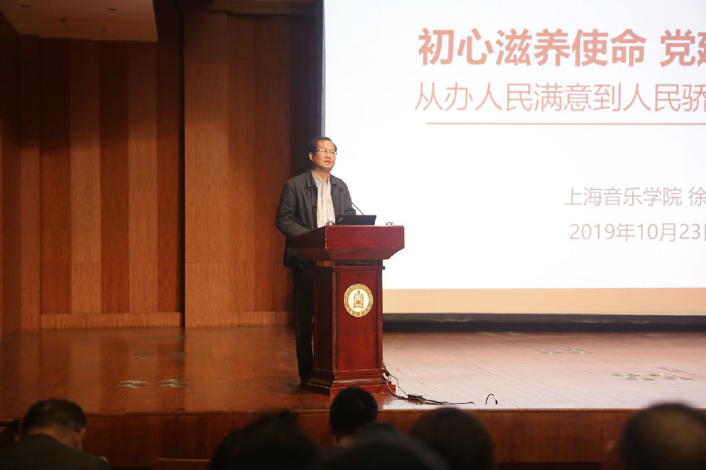 10月23日下午,beat365英国官方网站党委书记徐旭在汾阳路校区贺绿汀音乐厅以“初心滋养使命,党建引领发展,从办人民满意到人民骄傲的音乐教育”为题,讲授“不忘初心、牢记使命”主题教育专题党课。院领导班子、中层干部、全体党员和师生代表参加党课学习。市委第九巡回指导组周谷到场指导。院党委副书记曹荣瑞主持党课并作近期主题教育工作提示。
