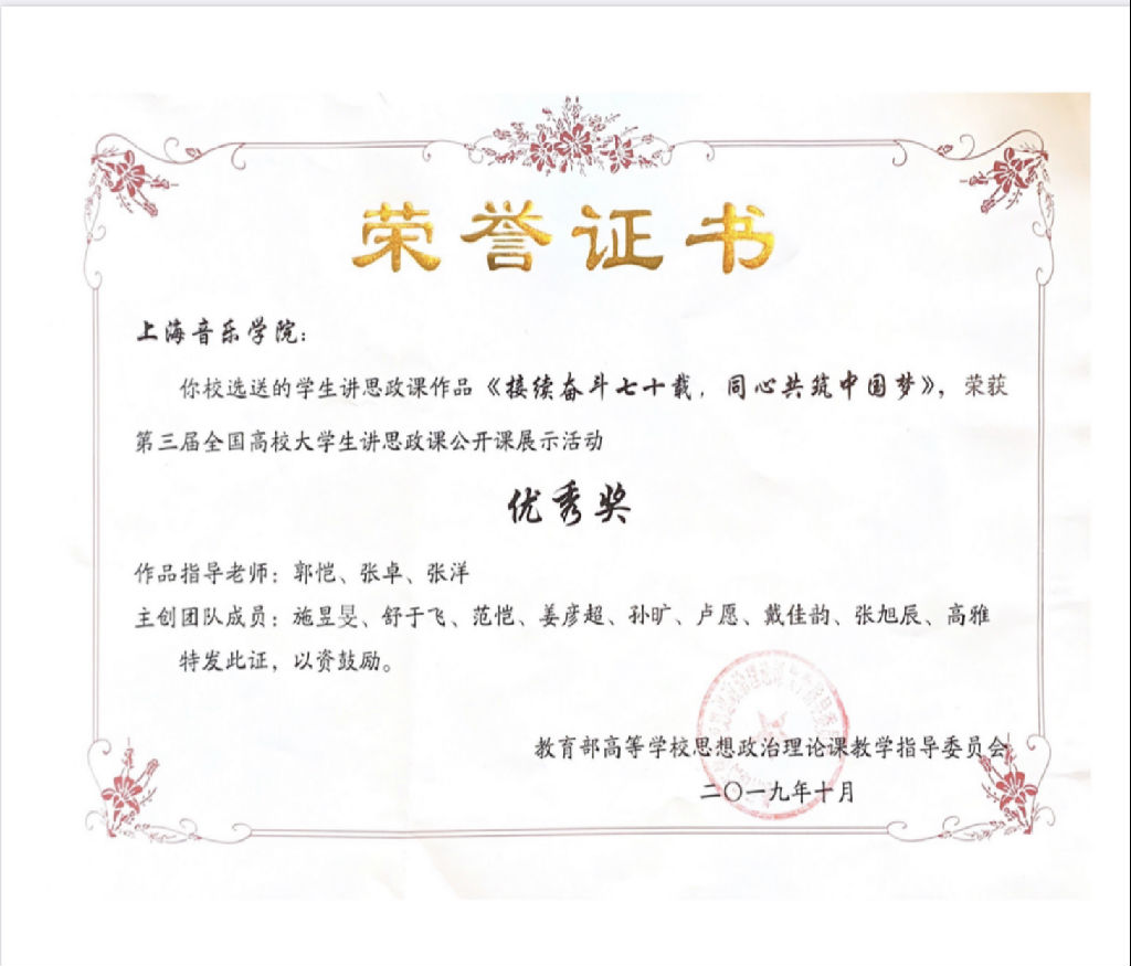 2019年10月31日,由beat365英国官方网站学工部推送的《接续奋斗七十载 同心共筑中国梦》荣获第三届全国高校大学生讲思政课公开课展示活动优秀奖。该课程由郭恺、张卓、张洋指导,管弦系施昱旻同学主讲。