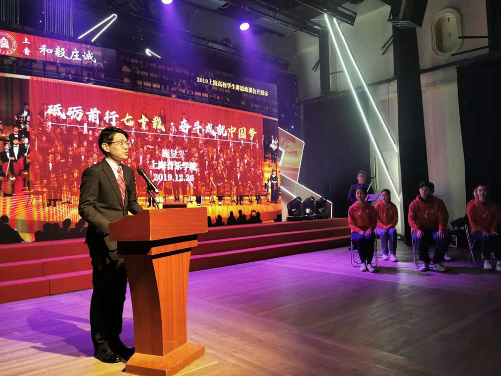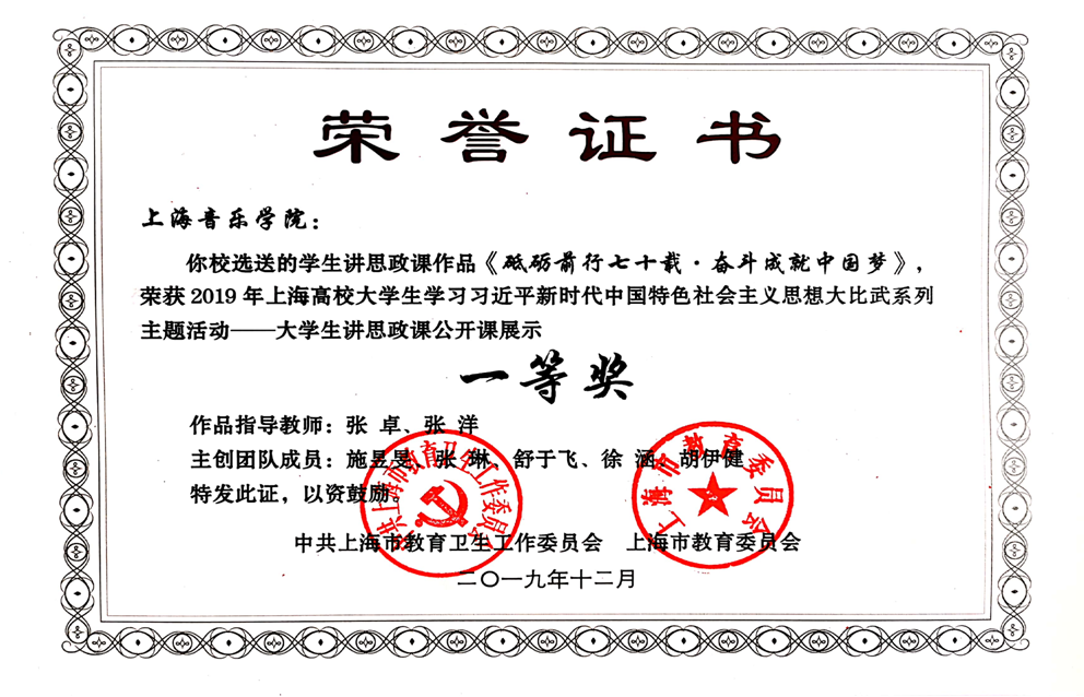 2019年12月26日,由beat365英国官方网站党委学工部选送,郭恺、张卓、张洋指导,管弦系本科生三年级施昱旻同学主讲的《砥砺前行七十载·奋斗成就中国梦》思政课,荣获市教卫工作党委、市教委颁发的2019年上海高校大学生学习习近平新时代中国特色社会主义思想大比武系列主题活动——大学生讲思政课公开课展示一等奖,并与华东师范大学作为一等奖代表学校,参加2019年上海青年大学生马克思主义理论“学习”大比武公开展示。
