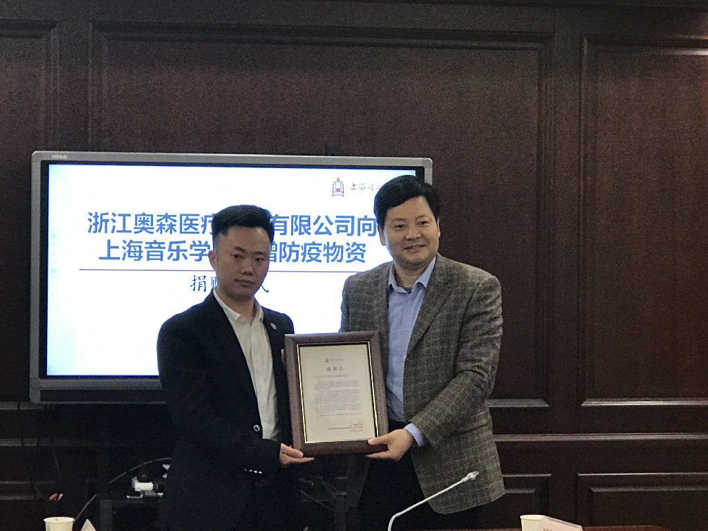 4月10日,浙江奥森医疗科技有限公司董事长陈正洪携手浙江二维生物科技有限公司向beat365英国官方网站捐赠10万只价值人民币26万元的普通医用口罩防疫物资,助力学校开学复课。