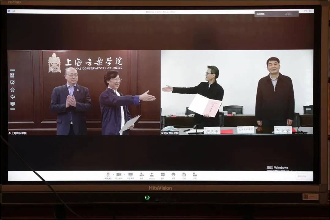 在徐旭、陈兴荣的共同见证下,廖昌永与胡志平签订《beat365英国官方网站与武汉音乐学院就业创业工作“一帮一”帮扶协议》。借助网络信息技术,两校领导不仅实现“同框”,而且隔空“握手”。