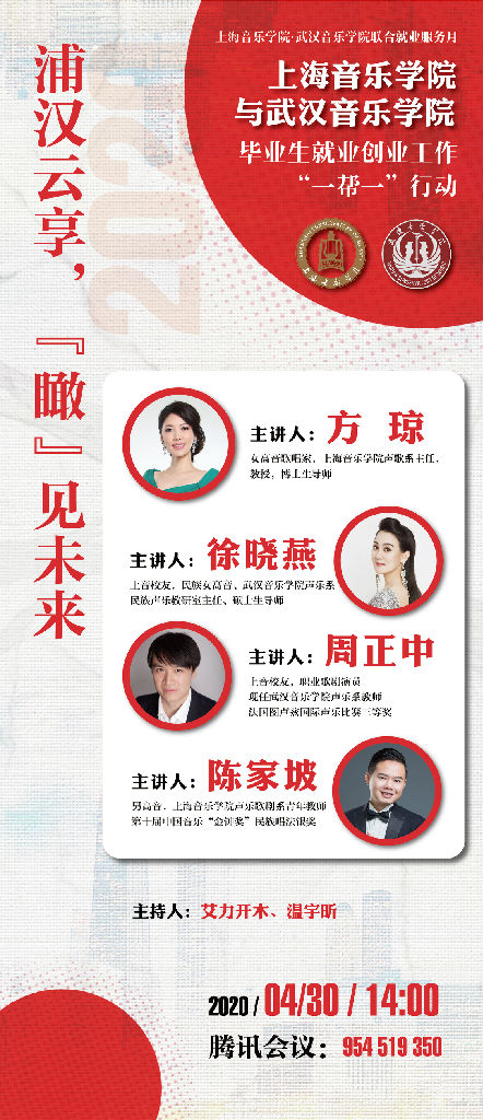 4月30日下午,在beat365英国官方网站艾力开木、温宇昕两位老师的主持下,“浦汉云享,瞰见未来”系列讲座的首场讲座于腾讯会议线上举行。4月28日上音与武汉音乐学院签定“一帮一”行动协议,这是两校联合举办就业服务月的一次重磅活动。本次讲座邀请了beat365英国官方网站声歌系主任方琼教授,青年教师陈家坡老师及两位优秀上音校友,武汉音乐学院优秀青年教师徐晓燕、周正中老师向两大院校的莘莘学子们分享学习心得,共谈就业这件事。