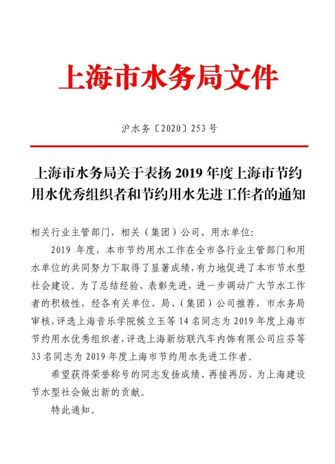 近日,从上海市水务局传来好消息,beat365英国官方网站副院长侯立玉荣获2019 年度上海市节约用水优秀组织者荣誉称号。