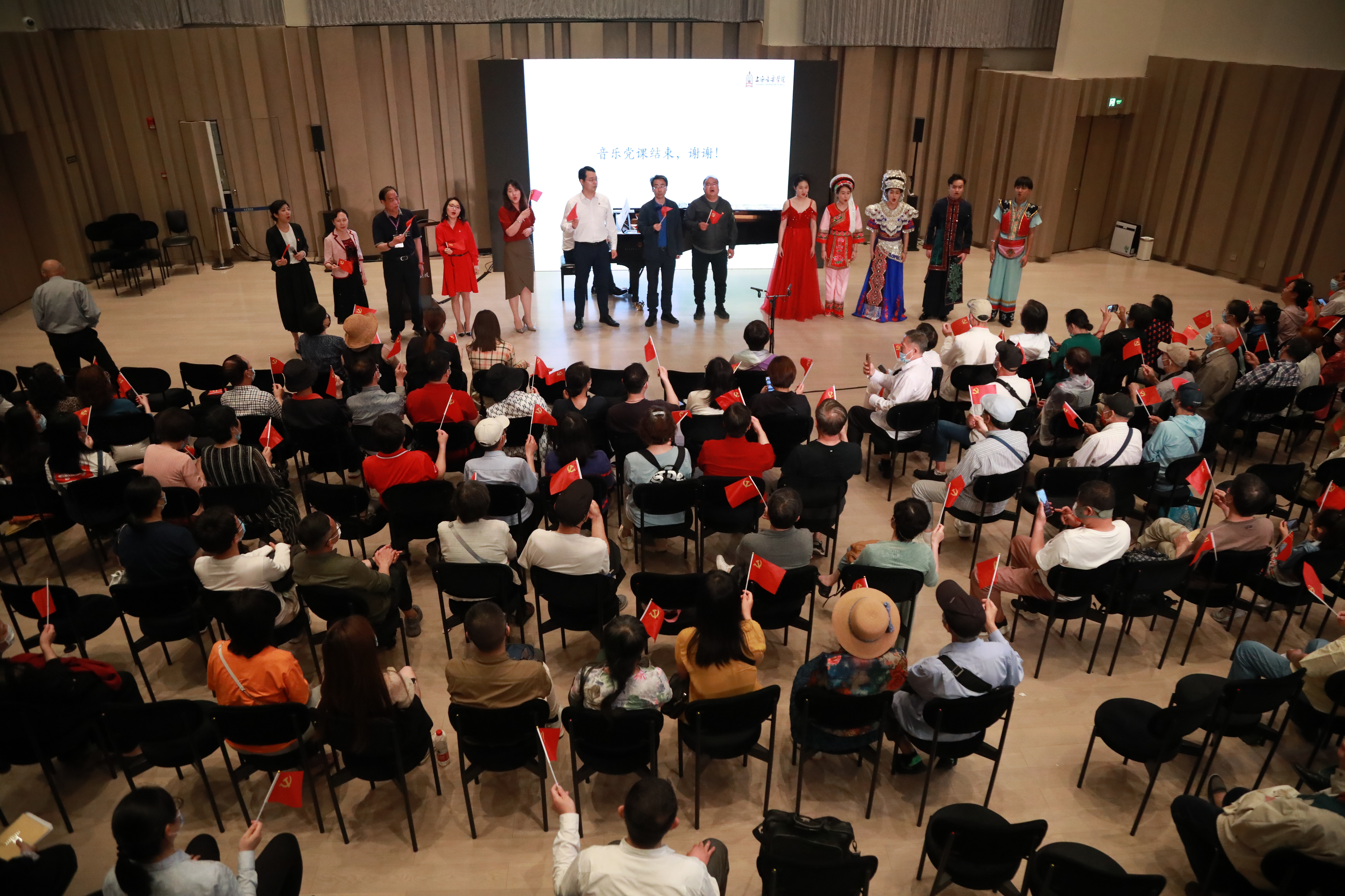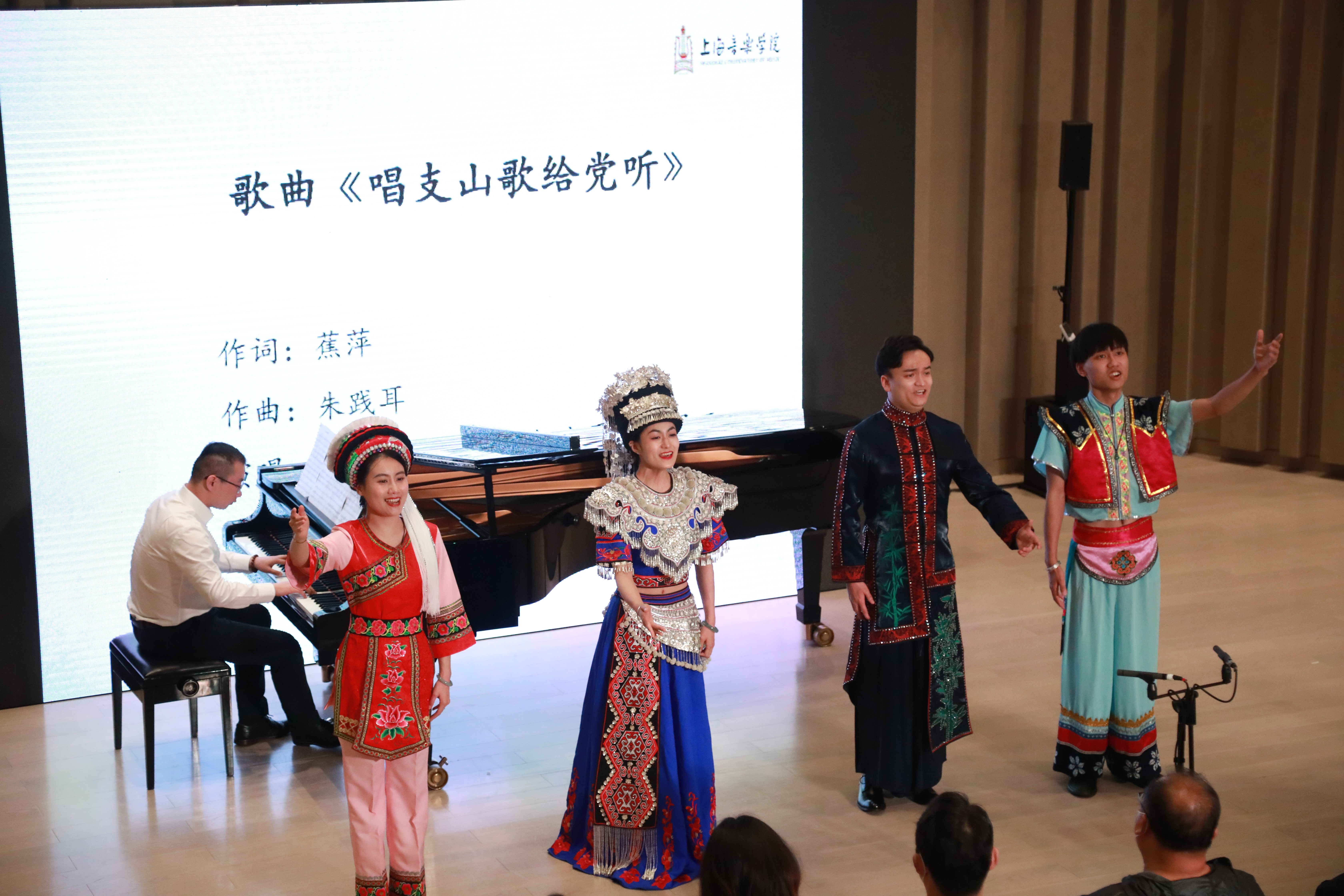 除了生动的讲解之外,“海尚音苑社”的部分社员以及最新选拔出的上音校史文化传播青春大使代表蔡昕润和李沛桐为大家现场演绎了上音校友刘庄所创作的《浪漫曲》、经典民族歌剧《江姐》的主题曲《红梅赞》,“四君子”组合以胡琴四重奏的形式诠释了上音老院长贺绿汀所作的《游击队歌》,张旭辰为大家献上了上音原创音乐剧《春上海1949》的选段。最后,来自仡佬族的张丁和来自白族的赵章利、赵广原和赵思雨四位同学带领全场观众一同唱响由上音知名校友才旦卓玛深情演绎的《唱支山歌给党听》,大家随着音乐舞动手中的小红旗,将全场气氛推至最高潮。