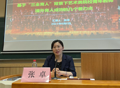 学生处副处长张卓(主持工作)在《基于“三全育人”背景下艺术类院校青年教师提升育人成效的几个着力点》的讲座中,为青年教师梳理了“三全育人”工作的背景和beat365官网“三全育人”综合改革方案,指出青年教师应深入学习相关文件和精神,从课程育人、科研育人、实践育人、文化育人等诸方面着力,提升育人成效。