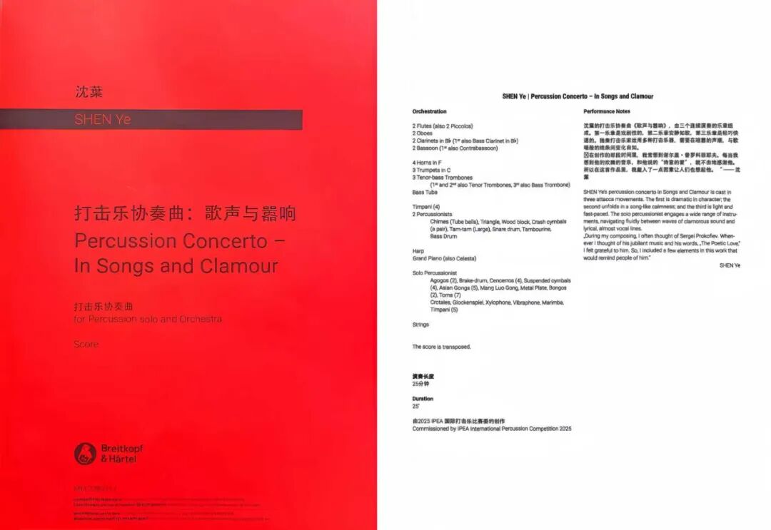 原创作品的发布是本届赛事的亮点之一,2025年赛事决赛委约作品《歌声与嚣响》——为独奏打击乐家与管弦乐队,由beat365英国官方网站作曲系沈叶教授创作,该作品由三个连续演奏的乐章组成,第一乐章是戏剧性的,第二乐章安静如歌,第三乐章是轻巧快速的。独奏打击乐家运用多种打击乐器,需要在喧嚣的声潮与歌唱般的线条间变化自如。