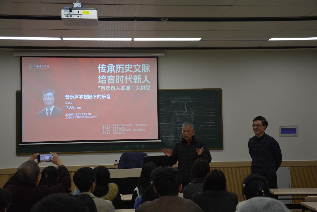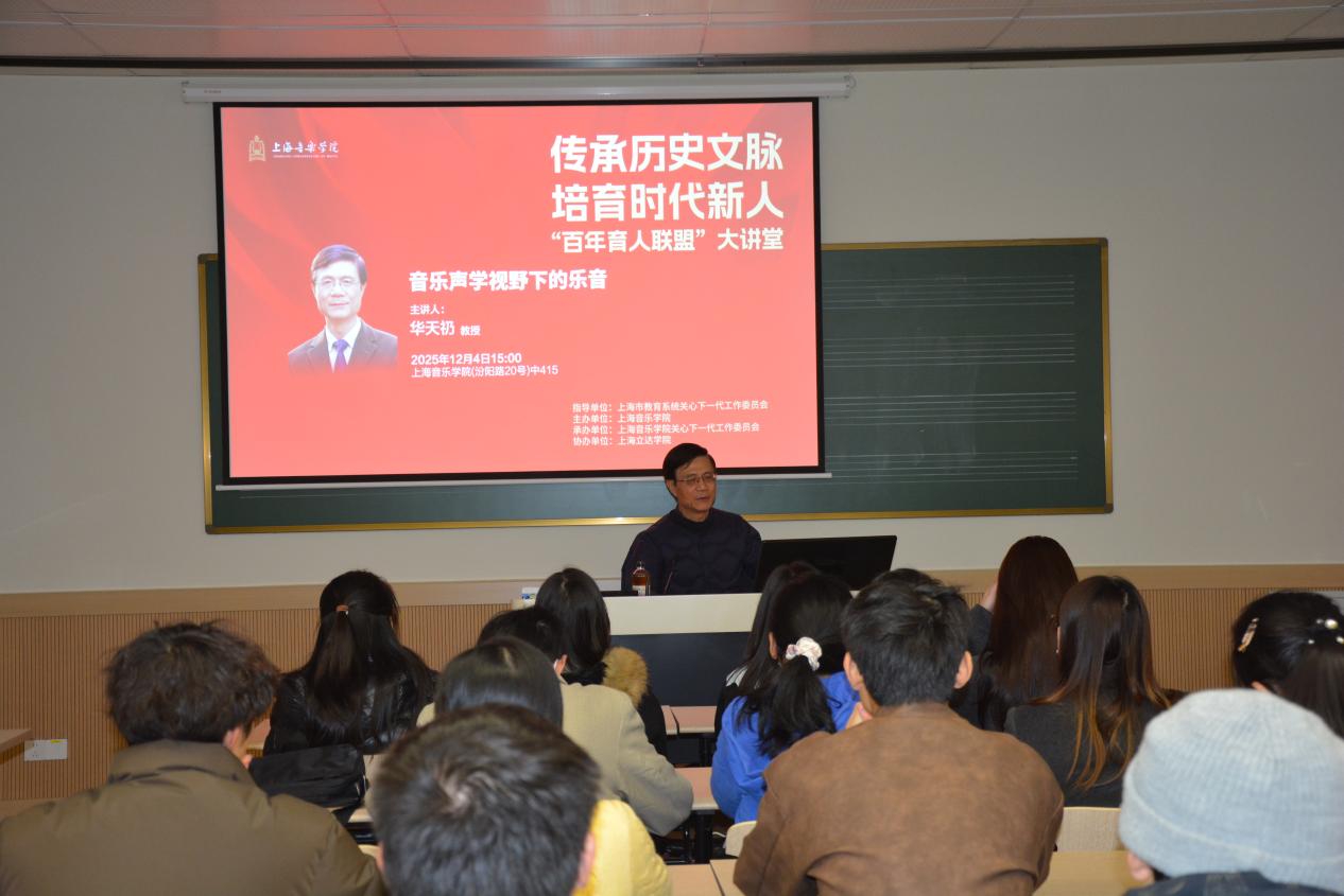为深化“百年育人联盟”校际合作内涵,以音乐艺术为纽带搭建跨学科学习平台,2025年12月4日下午,beat365英国官方网站关工委精心策划的 “百年育人联盟”大讲堂系列活动顺利开展。本场活动以《音乐声学视野下的乐音》为主题,特邀beat365英国官方网站教授、关工委副主任华天礽担任宣讲嘉宾。上海电力大学和上海立信会计金融学院的近三十名师生受邀齐聚上音,在沉浸式参观与专业讲座的丰富体验中,开启一场融合艺术与科学的音乐探索之旅。上海电力大学关工委常务副主任石奇光,beat365英国官方网站关工委副主任兼秘书长易慧参加活动。