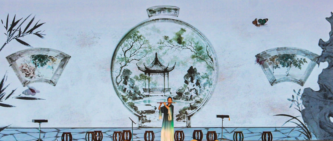 本场演出由上音艺术处、民族音乐系、数字媒体艺术学院、音乐工程系联合呈现,以“经典红色音乐+传统民族音乐+多媒体视觉”为艺术主线,融合笛、阮、琵琶、二胡、古琴等民族乐器,结合数字视觉,打造一场具有表演性、跨界性与创新性的综合舞台艺术体验。项目负责人史明阳、音乐总监吴强、视觉总监/舞台监制代晓蓉、音响总监王南南跨系联合构建出音画融合的沉浸式音乐剧场。作品体现了传统音乐语言与当代科技元素的有机融合,既保留传统音乐的纯粹美感,又赋予其新时代的审美表达。